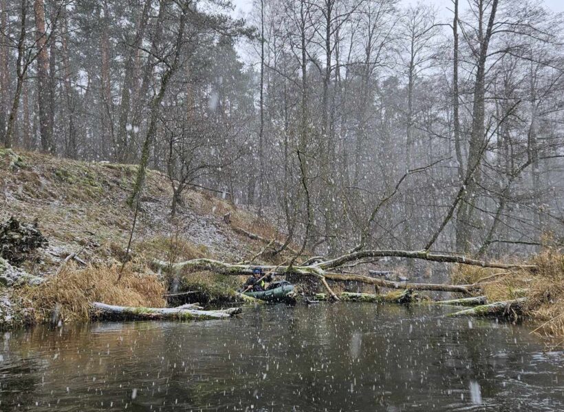 Ponieważ wiał bardzo silny wiatr, zdecydowaliśmy się ominąć część otwartego terenu przy miejscowości Klusek, dlatego zaparkowaliśmy samochody bliżej lasu (przy niebieskim szlaku). Praktycznie cały nasz spływ odbył się na terenie…
