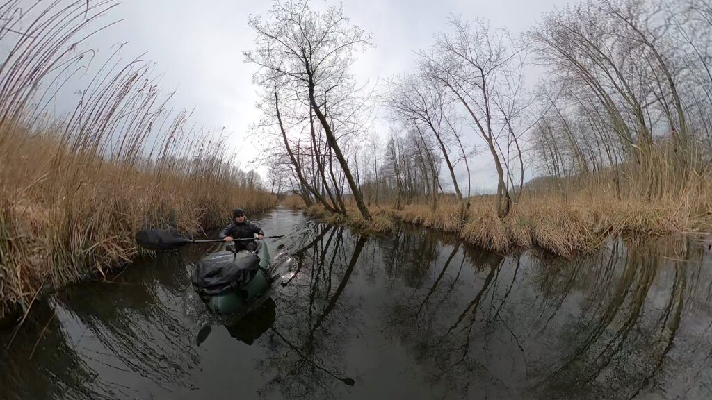 Po około 1,5 km płynięcia szerokim i prostym kanałem dotarłem do jazu, od którego prowadziła najwygodniejsza droga powrotna.