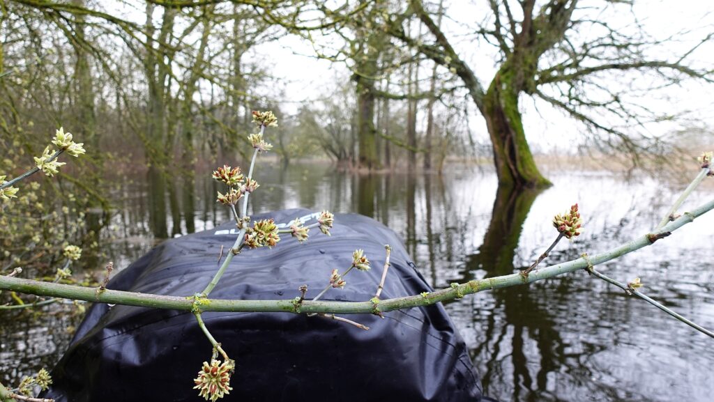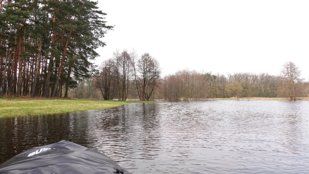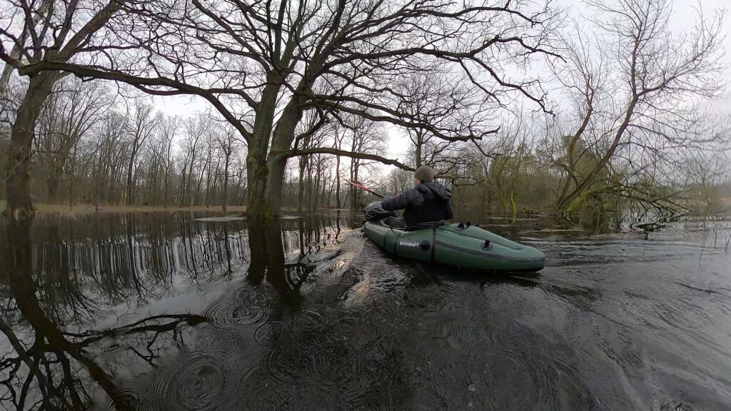 Okazało się, że praktycznie cały obszar w okolicy Warty jest zalany i starorzecza są obecnie połączone z głównym nurtem rzeki. Postanowiłem położyć się spać, aby rano przywitać słońce już na packrafcie.