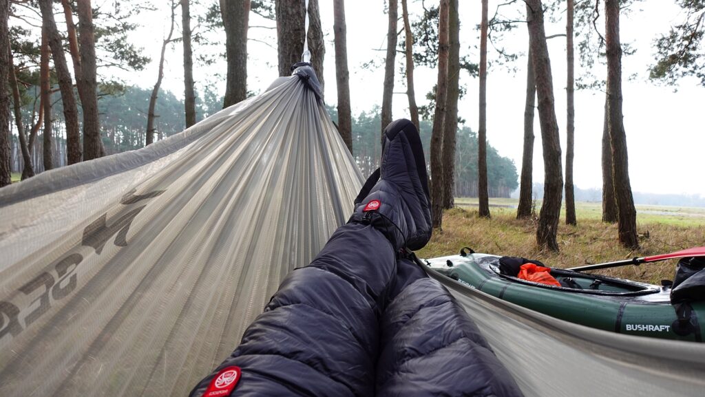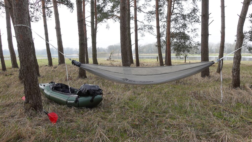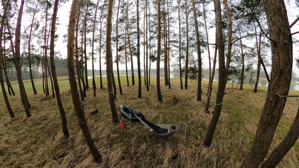 Trochę byłem zdziwiony tym, że tak piękne miejsce w sobotę odwiedzam sam. Wróciłem do packrafta i pływając po kolejnych rozlewiskach i w górę lekkiego nurtu, dopłynąłem do sosnowej wysepki, gdzie przygotowałem sobie posiłek, po którym zasnąłem na półgodzinną drzemkę w hamaku.