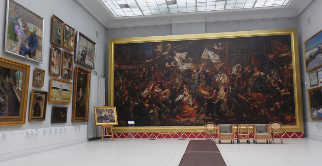Po wypiciu gorącej herbaty jaka pozostała mi w termosie, popłynąłem w stronę Warty, aby inną drogą powrócić do miejsca rozpoczęcia spływu. Chciałem jeszcze trochę nacieszyć się widokiem łęgów, ale za godzinę zamykano galerię pałacową, którą również chciałem zobaczyć. Znajduje się tam największe gabarytowo dzieło Jana Matejki – Joanna d’Arc. Później jeszcze raz spacer po parku – tym razem już z biletem i w dużo większym towarzystwie innych turystów. Po powrocie do samochodu okazało się , że parking na którym spędziłem całą dobę, również jest płatny (chociaż nie ma takich oznaczeń). Po zakupie biletu parkowego i opłaceniu parkingu pod koniec mojej przygody, z Rogalina mogłem wyjechać z czystym sumieniem :).