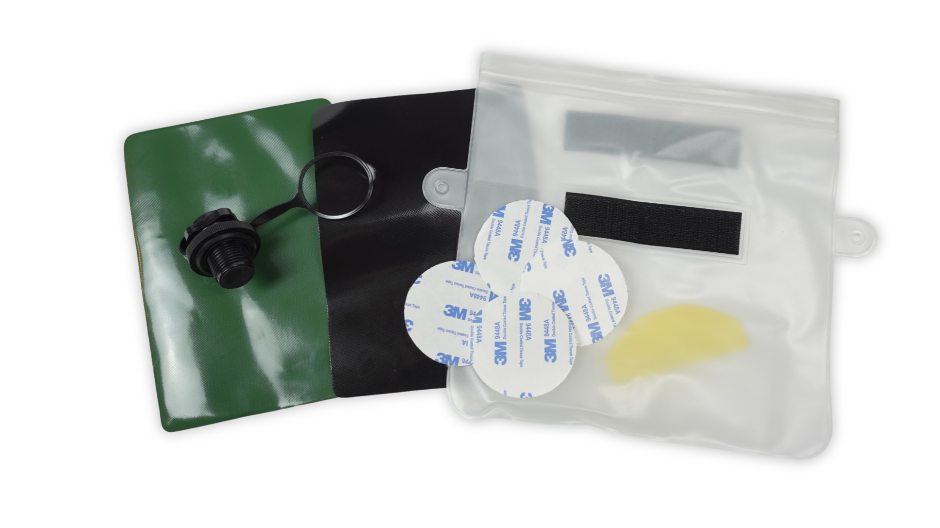 Zestaw naprawczy w wodoszczelnym opakowaniu, zawór bostoński, kawałki materiału na burty i podłogę, łatki do szybkiej naprawy w terenie.