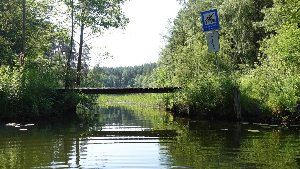 Wracam na Skarlankę i w miejscowości Grzmięca mam pierwszą bardzo łatwą i oznaczoną przenoskę przy młynie. Wpływam na kolejne Jezioro Strażym. Tutaj mocny, przeciwny wiatr daje się odczuć najbardziej. Dlatego nie decyduję się na odbicie do Jeziora Zbiczno, ponieważ powrót będzie z mocnym przeciwnym wiatrem. Przebijam się przez jezioro Strażym, aby jak najszybciej znaleźć się w przesmyku Skarlanki, która płynie tutaj przy rezerwacie Bachotek. Ściana drzew skutecznie zatrzymuje przeciwny wiatr. Pod niskim mostkiem wpływam na ostatnie Jezioro Bachotek, później zawracam i wychodzę wygodnym wyjściem przy mostku, gdzie znajduje się również wiata turystyczna.