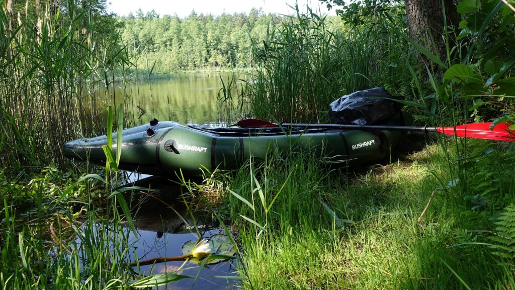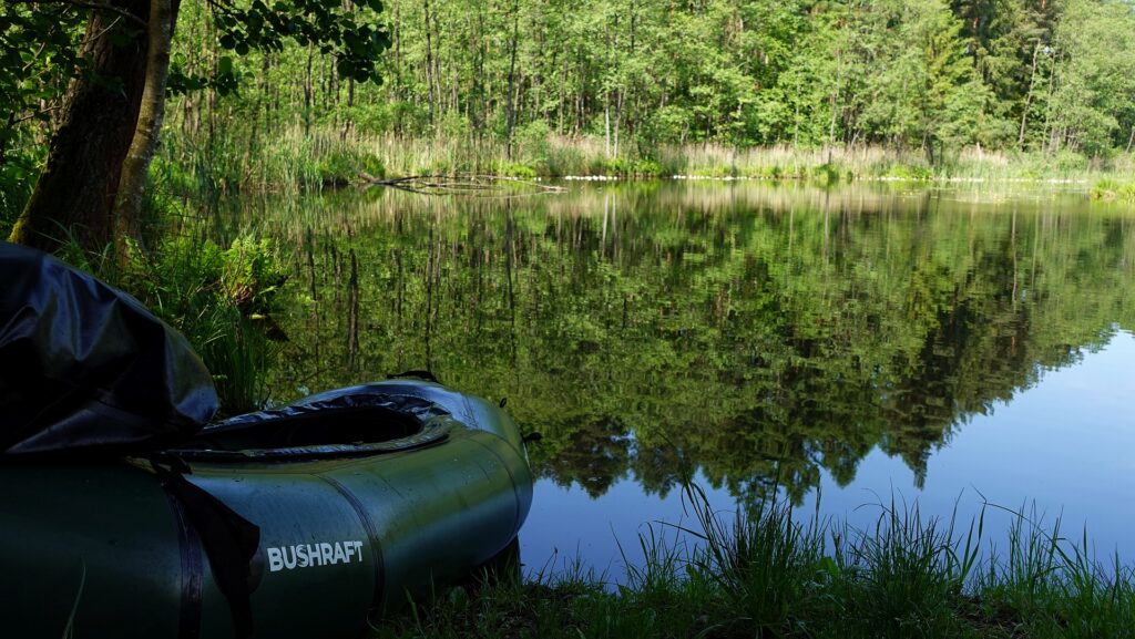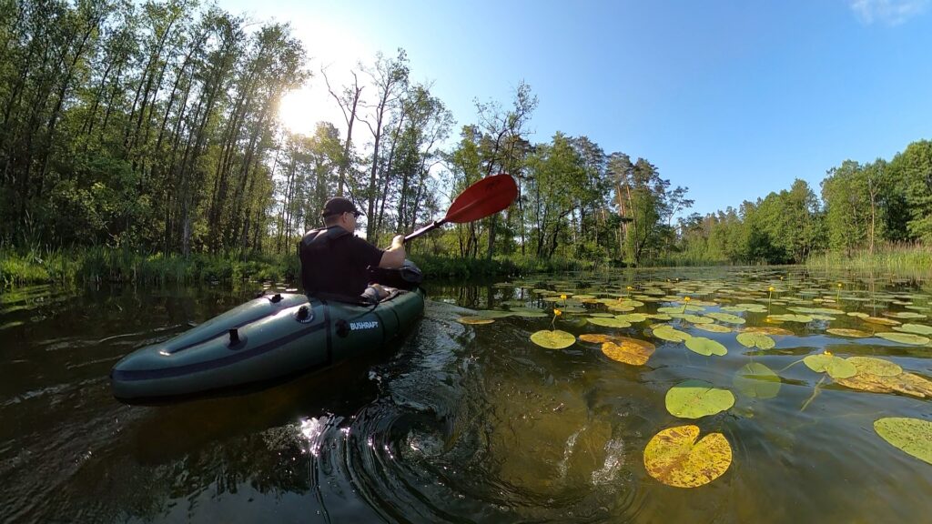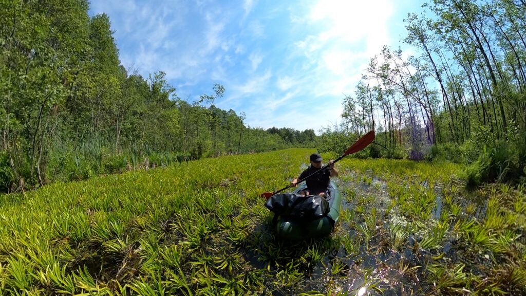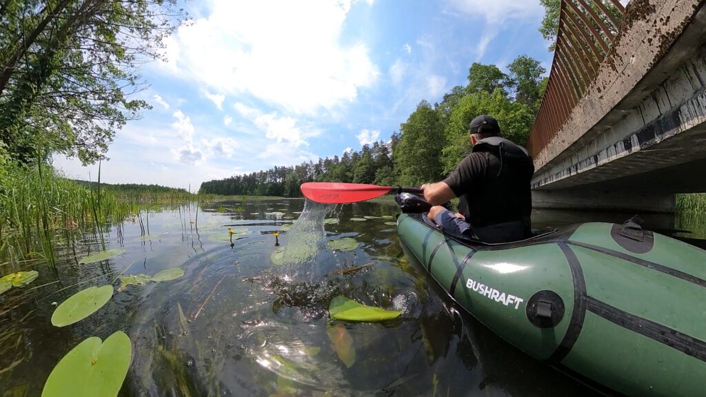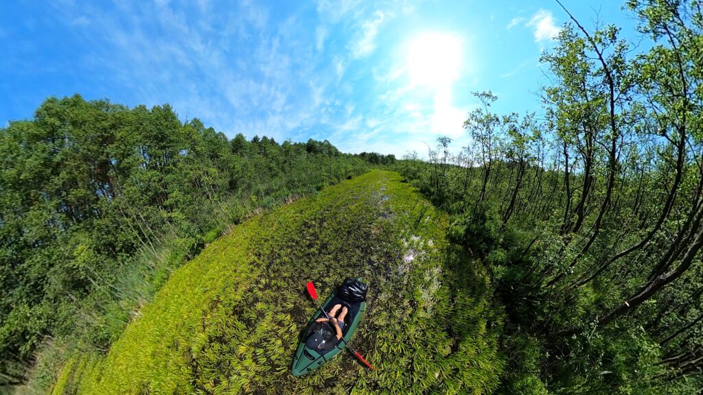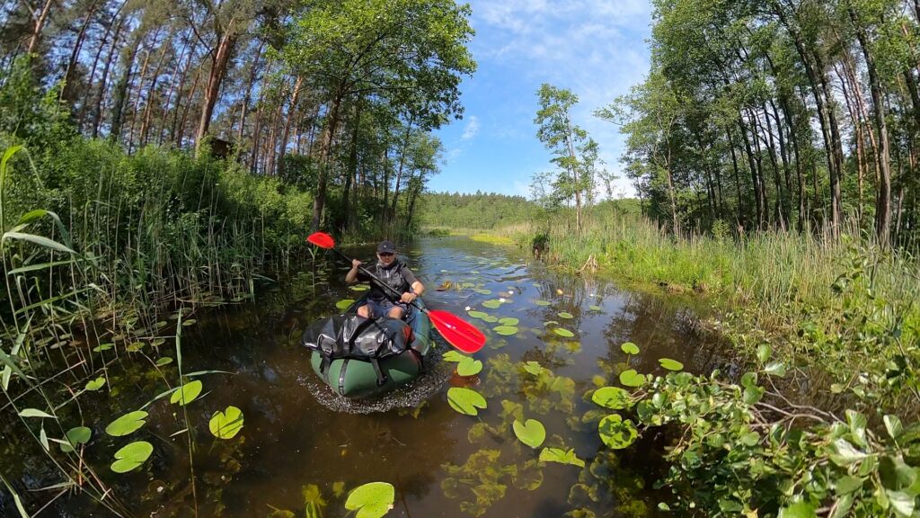 Kiedy rano obudziłem się nad Jeziorem Skarlińskim przy miejscowości Biedaszek, poszedłem sprawdzić stan wody w Skarlance, ponieważ wędkarze powiedzieli mi, że teraz Skarlanką nie da się spłynąć. Niestety ich słowa potwierdziły się – stan wody był taki niski, że spływ byłby raczej spacerem. Byłem tym trochę zawiedziony, ponieważ dalszy odcinek Skarlanki łączący kilka jezior, wydawał mi się nieco nudnawy dla packrafta. Jakże się myliłem!:)