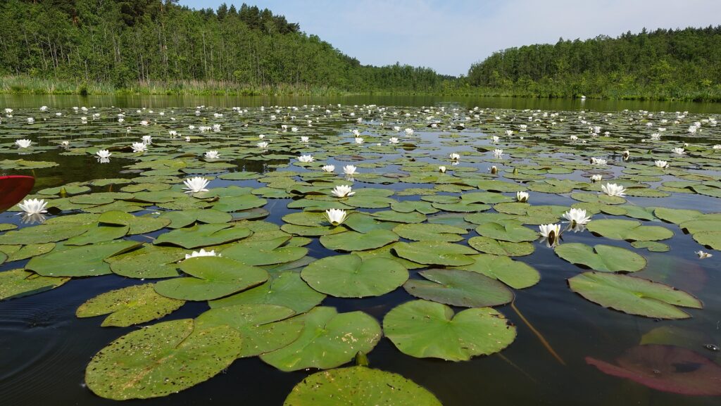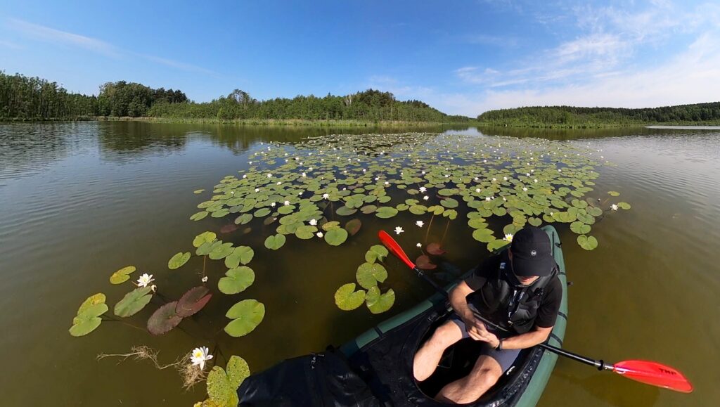 Wpływam do kolejnego polodowcowego Jeziora Kurzyny, które przypomina szeroką rzekę. Po obu stronach mamy obszary chronione, dlatego przyroda wygląda tutaj bardzo dziewiczo. Stąd możemy również odbić do Jeziora Strzemiuszczek. Jednak przesmyk zarośnięty jest zielonym dywanem, ale da się po nim płynąć. Znowu zachwycam się przyrodą.