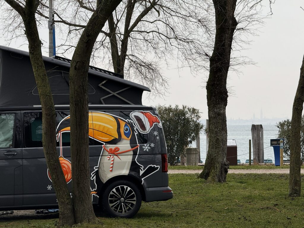 Jeżeli ktoś planuje odwiedzić Wenecję z packraftem i namiotem lub kamperem, polecam kemping Fusina – bardzo dobrą bazę startową z widokiem na Wenecję i dogodnym tramwajem wodnym kursującym co godzinę (ok. 20 minut do centrum). Koszt rozbicia namiotu na kempingu to 11 euro za dobę plus 11 euro za osobę. W cenie są czyste łazienki z gorąca wodą, a w sezonie (od czerwca) również basen.
