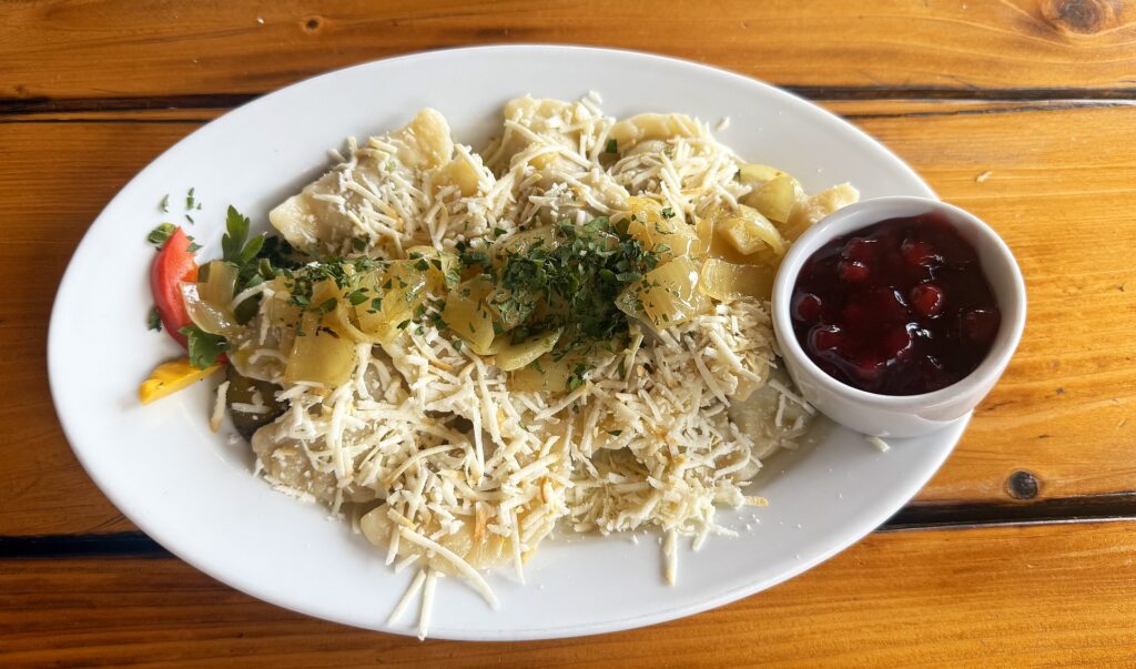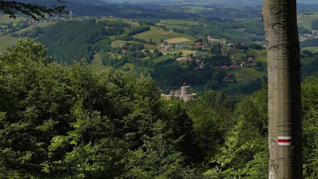 Przy zamku w Rytrze opuszczam rzekę i wspinam się Głównym Szlakiem Beskidzkim (czerwonym) do Kretówek – pięknego punktu widokowego. Dalej szlak się wypłaszcza, więc dalszy marsz jest już spokojniejszy. W schronisku Cyrla dostaję pierogi nadziewane jagnięciną, posypane oscypkiem i żurawiną. Czysta poezja smaku!