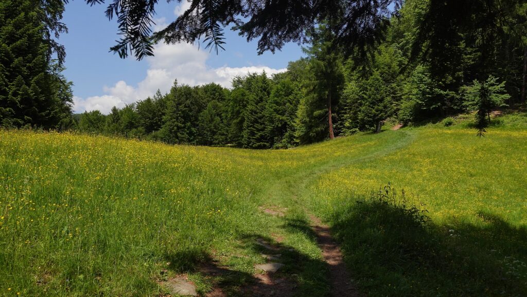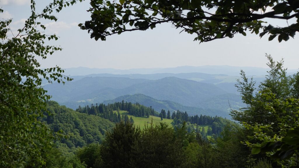 Za schroniskiem wchodzę w bukowy las. Nagle słyszę góralski śpiew – okazuje się, że to grupka kobiet z Rytra wybrała się na spacer i po prostu… śpiewają na szlaku. Ich głosy niosą się po okolicznych halach i wioskach, tworząc niesamowity klimat.