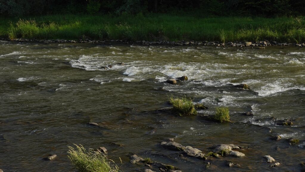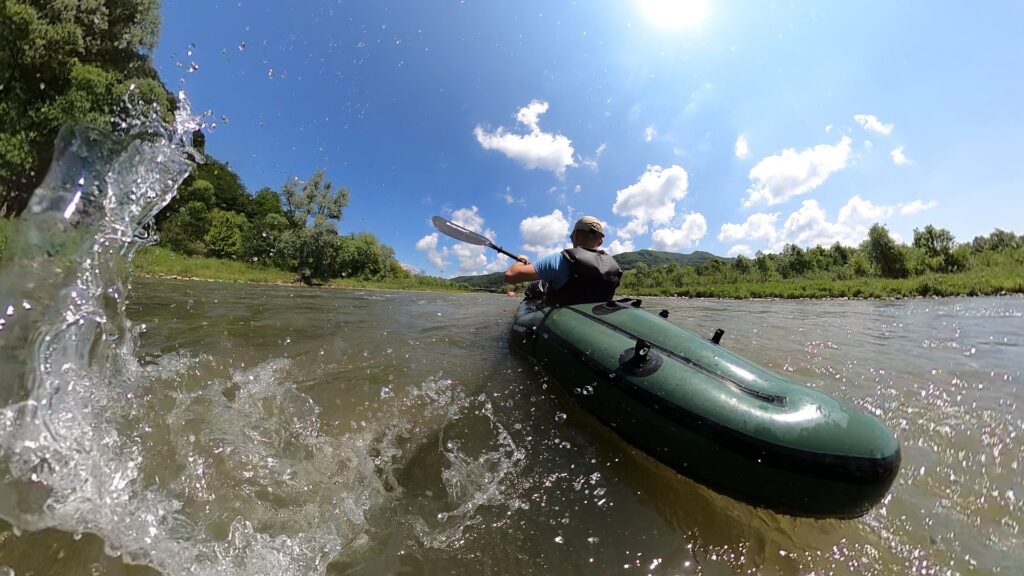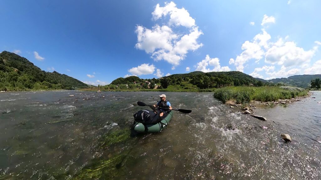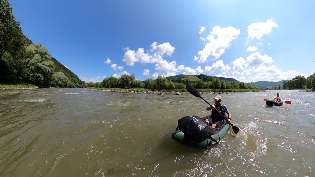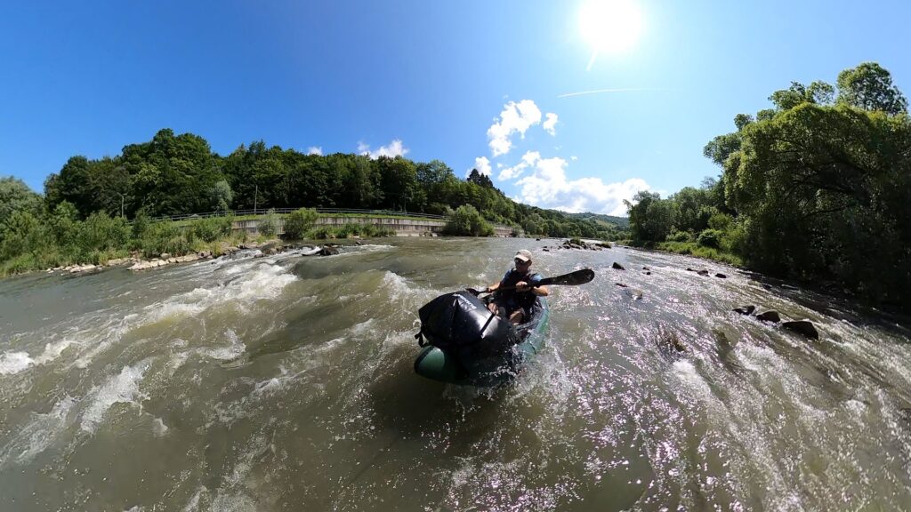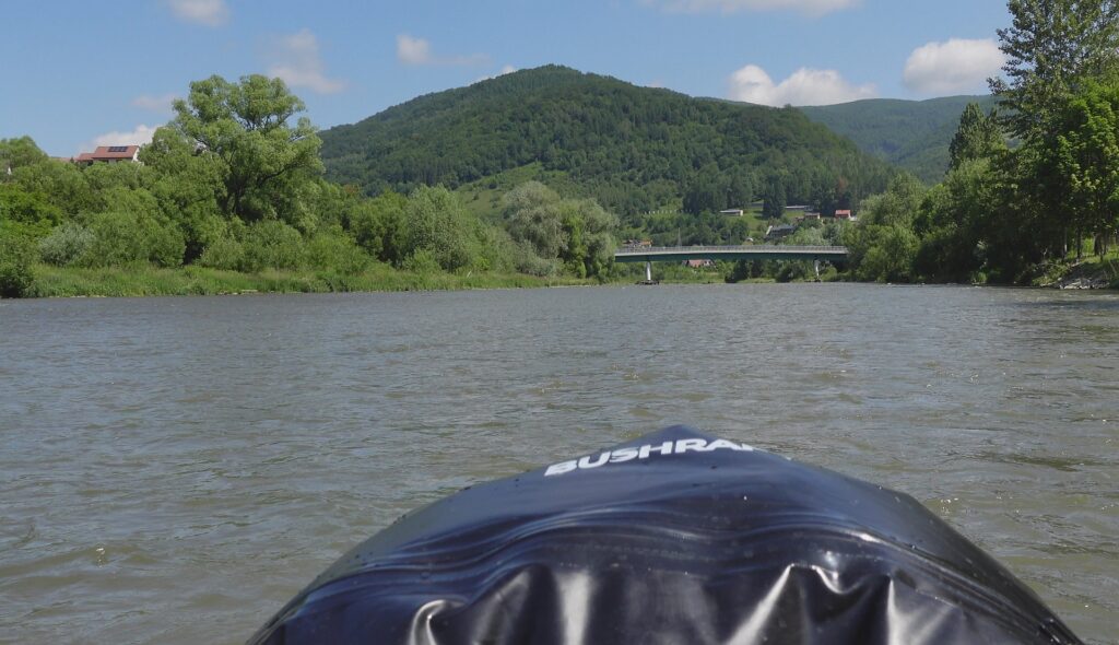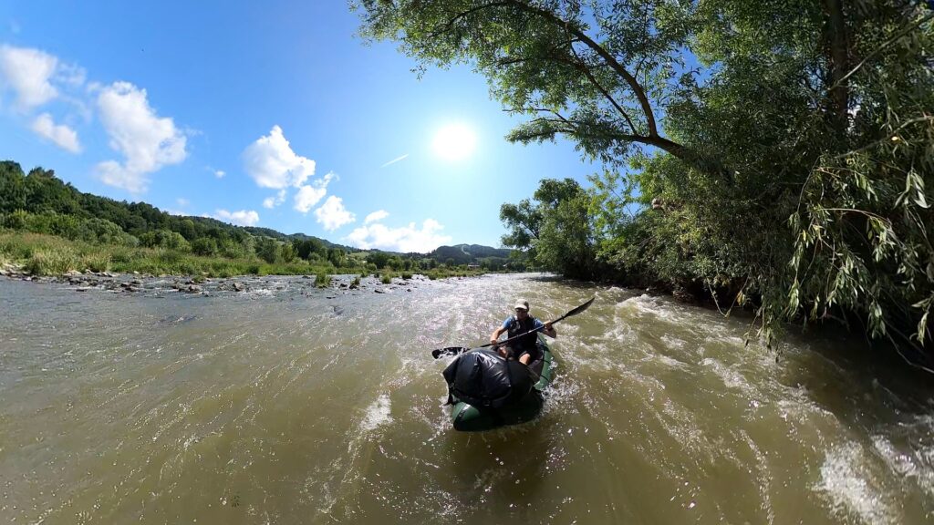 Na brzegu pompuję packrafta i… poznaję Andrzeja – również z packraftem. Przypadek? Totalny zbieg okoliczności! Wchodzimy na wodę niemal jednocześnie. Wspólna kawa, szybka wymiana planów na dzień – trochę się różnią, ale spływ do Rytra pokonujemy razem. Poprad na tym odcinku zaskakuje. Spodziewałem się spokojnej wody, a po ostatnich opadach rzeka buja nami całkiem solidnie. Liczne bystrza pojawiają się dość często i nadają rytm spływowi.
